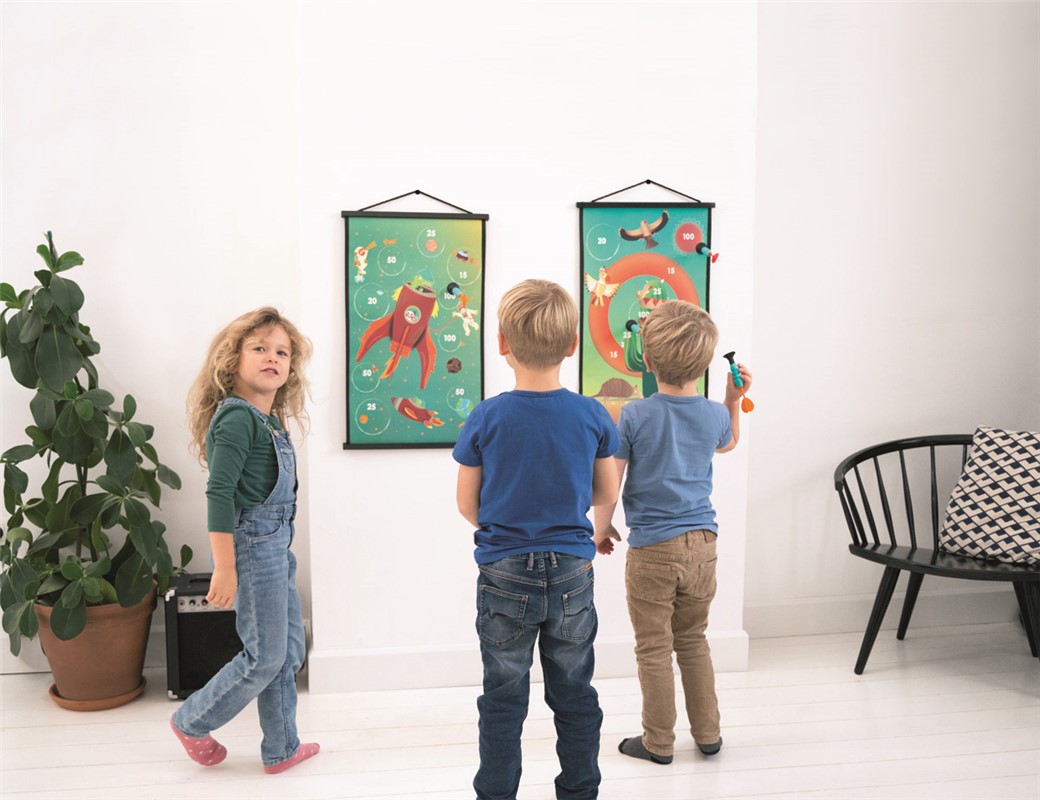 Trata de lanzar los 6 dardos con ventosa con toda tu fuerza y puntería. Y si la diana circular te parece demasiado fácil, ¡prueba girando la diana y jugando con el otro lado!