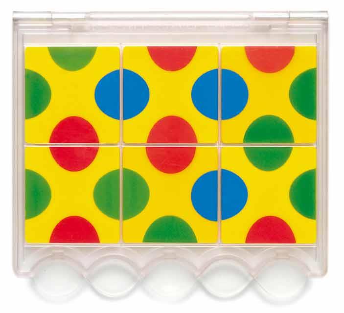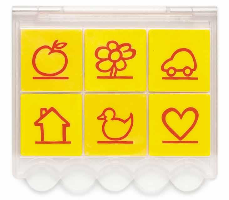 - Trae un estuche transparente con 6 fichas de plástico, cada ficha tiene un dibujo diferente por un lado, y por el otro entre las 6 fichas completan un dibujo, que es el que nos dice si el resultado del ejercicio está bien