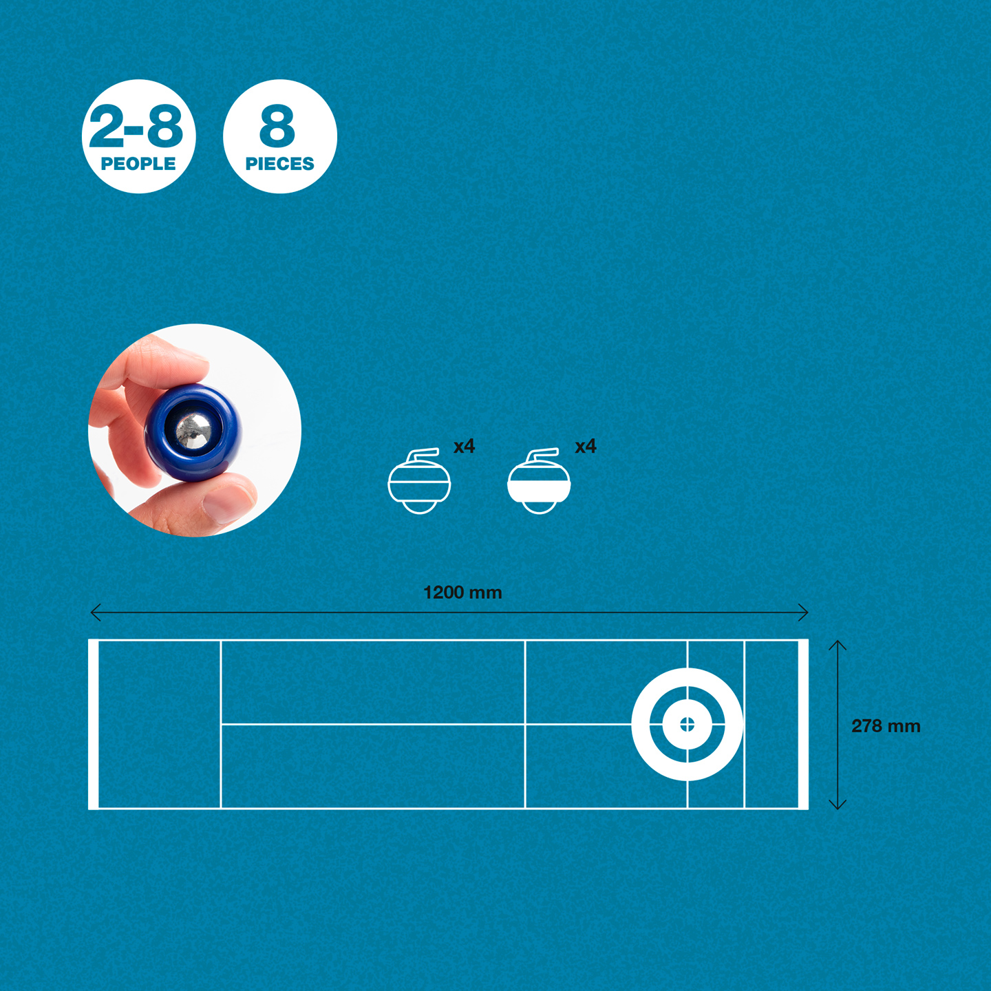 ¿Preparado para demostrar tu puntería y precisión? Con este curling sobre mesa tendrás dos oportunidades durante tu turno para lanzar tu pieza lo más cerca posible de la diana central. Cuando acaben las 10 rondas de juego, el jugador o equipo que haya logrado encajar más piezas en la diana, ganará la partida.