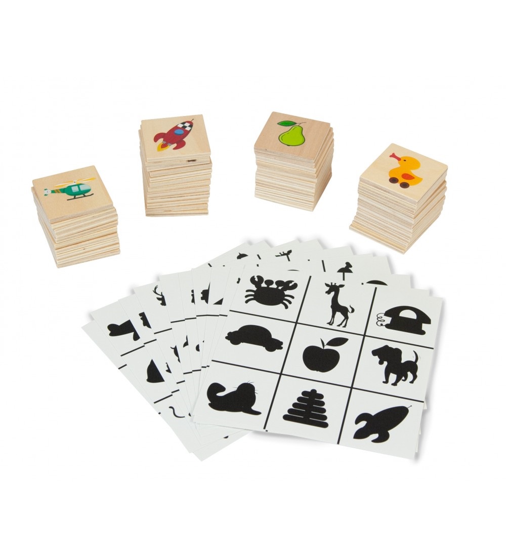 - Trae 10 plantillas de cartón con 9 sombras cada una y 45 fichas de madera con los dibujos en color