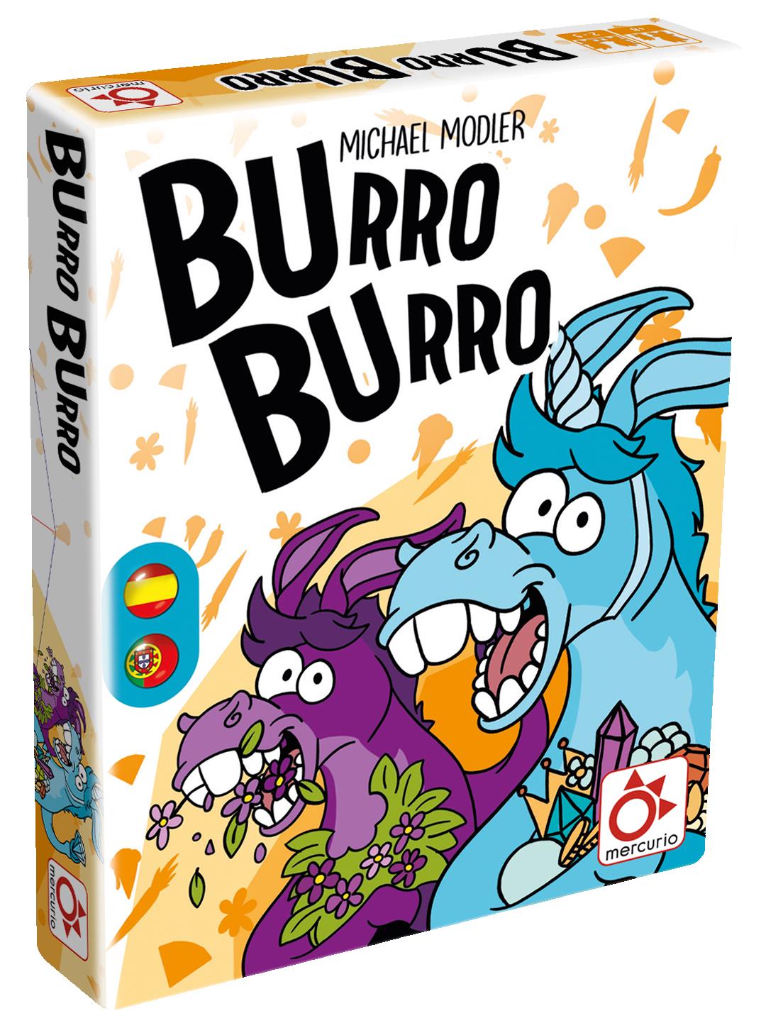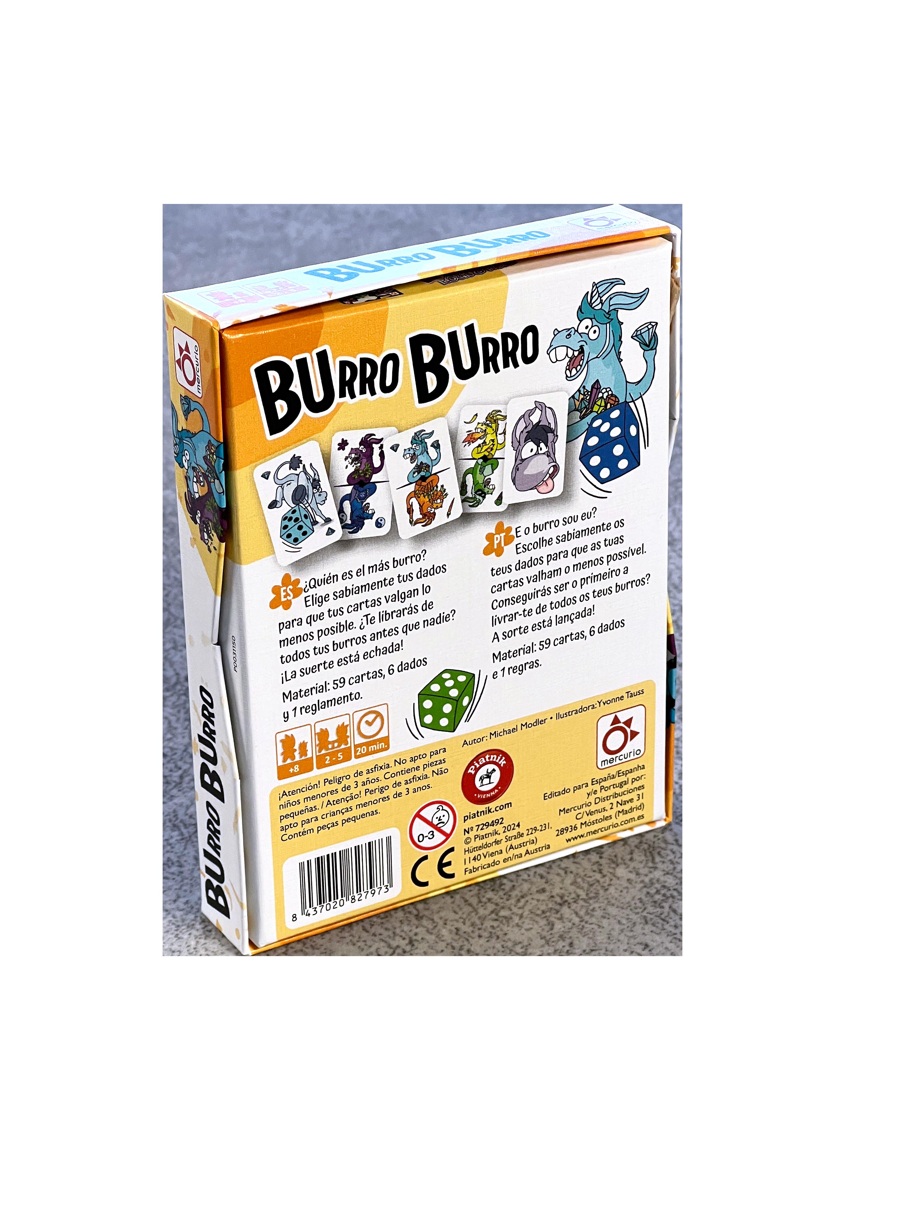 - Incluye 51 cartas de doble burro (dos de colores diferentes), 6 cartas de burro enfadado, 1 carta de burro grande, 1 carta de forraje y 6 dados de colores diferentes