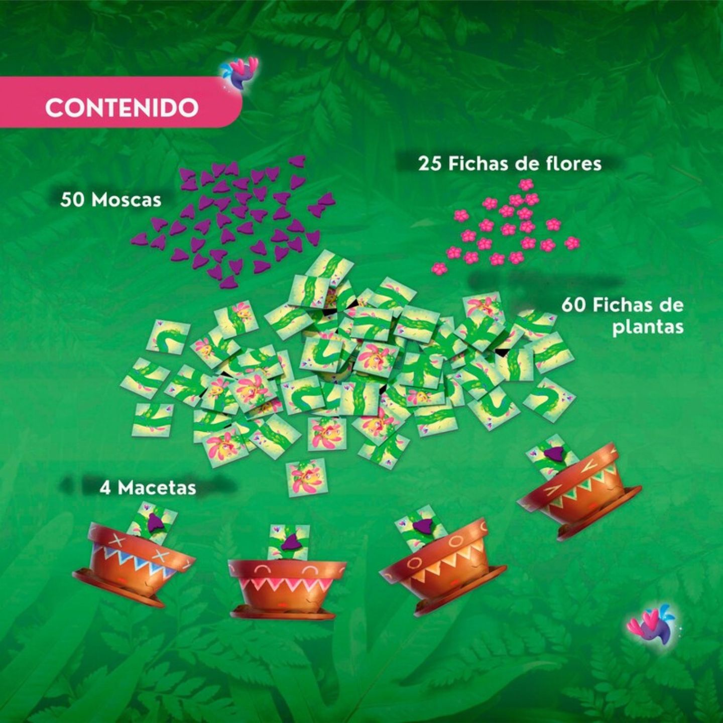 - Contiene 60 fichas de planta,. 25 flores, 4 macetas y 50 moscas