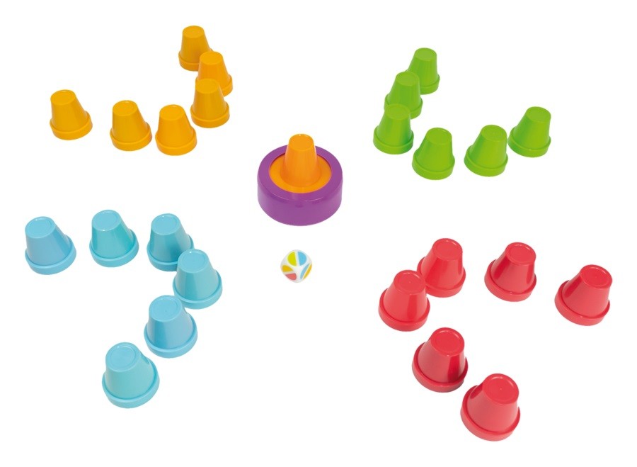 - Incluye 1 base sobre la que apilar los cubiletes, un dado que determina el color por el que debéis empezar y 24 cubiletes (6 de cada color)