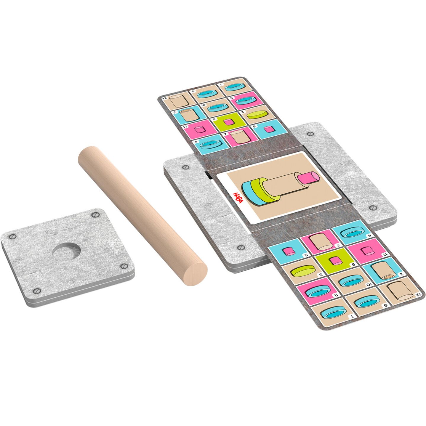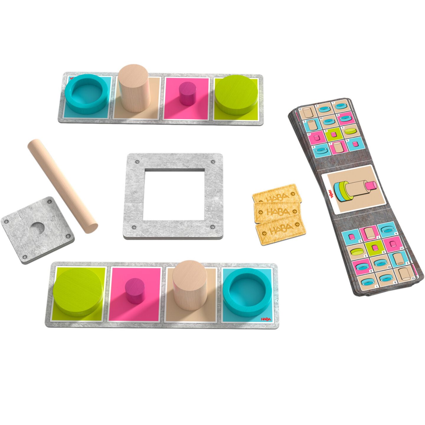 - Contiene 2 cadenas de montaje, 8 piezas (2 discos, 2 cilindros, 2 barriles y 2 anillos), 1 prensa, 20 tarjetas de retos con 40 desafíos (fácil y difícil) y 3 tickets dorados