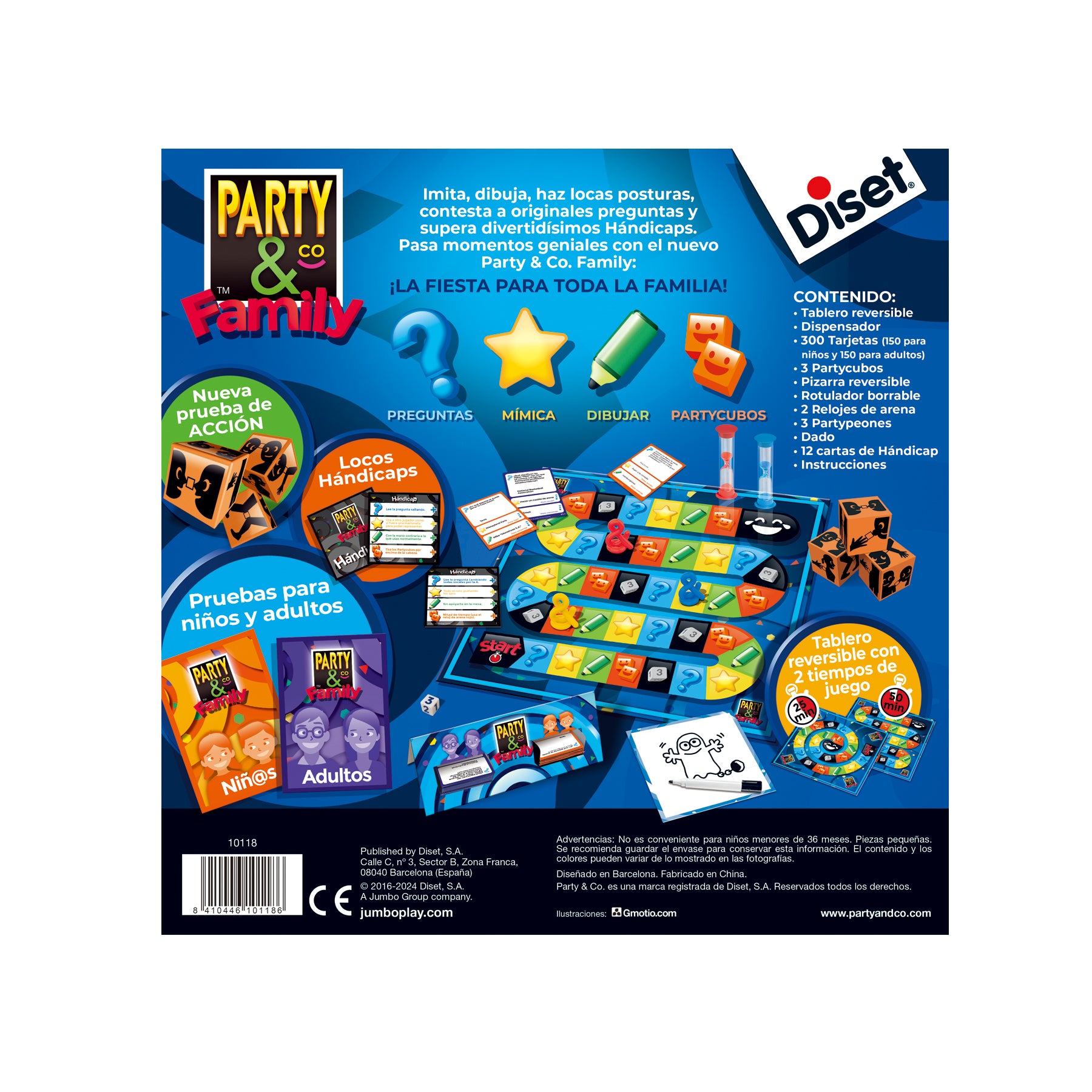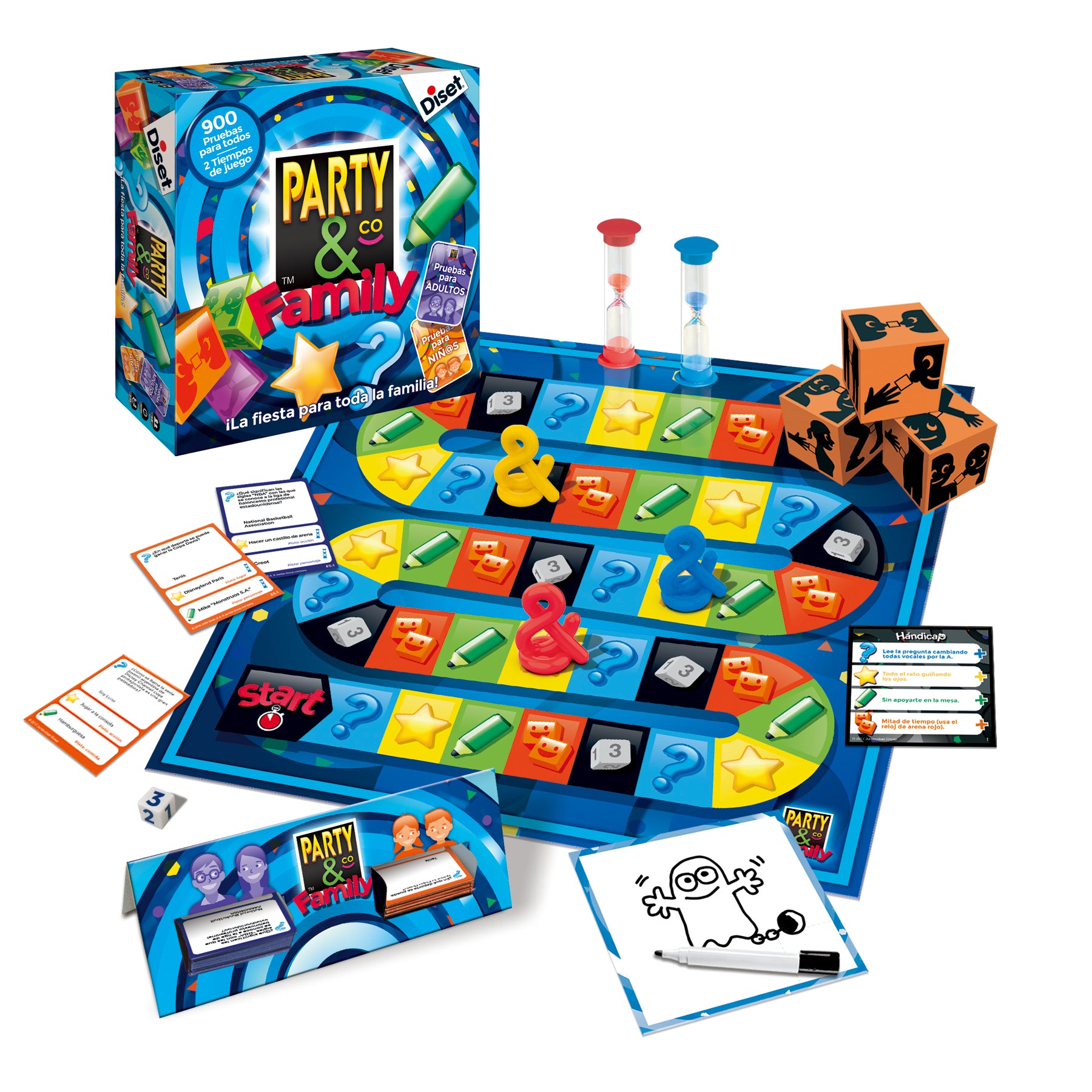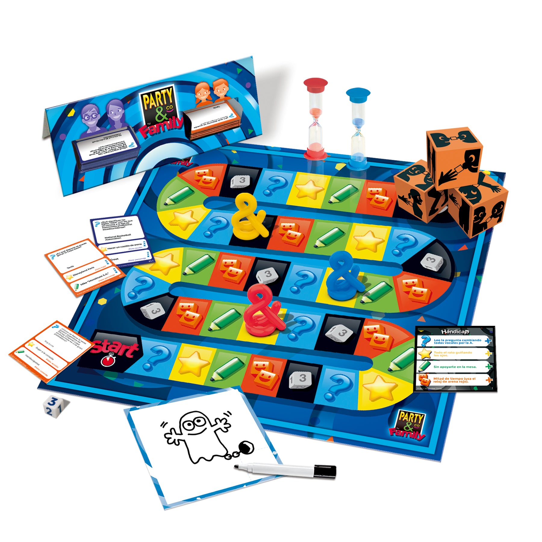 - Contiene 1 tablero reversible, 1 dispensador, 300 tarjetas (150 para adultos, 150 para niños), 3 party cubes, 1 pizarra, 1 rotulador borrable, 2 relojes de arena, 3 peones, 1 dado y 12 cartas de hándicap/reto