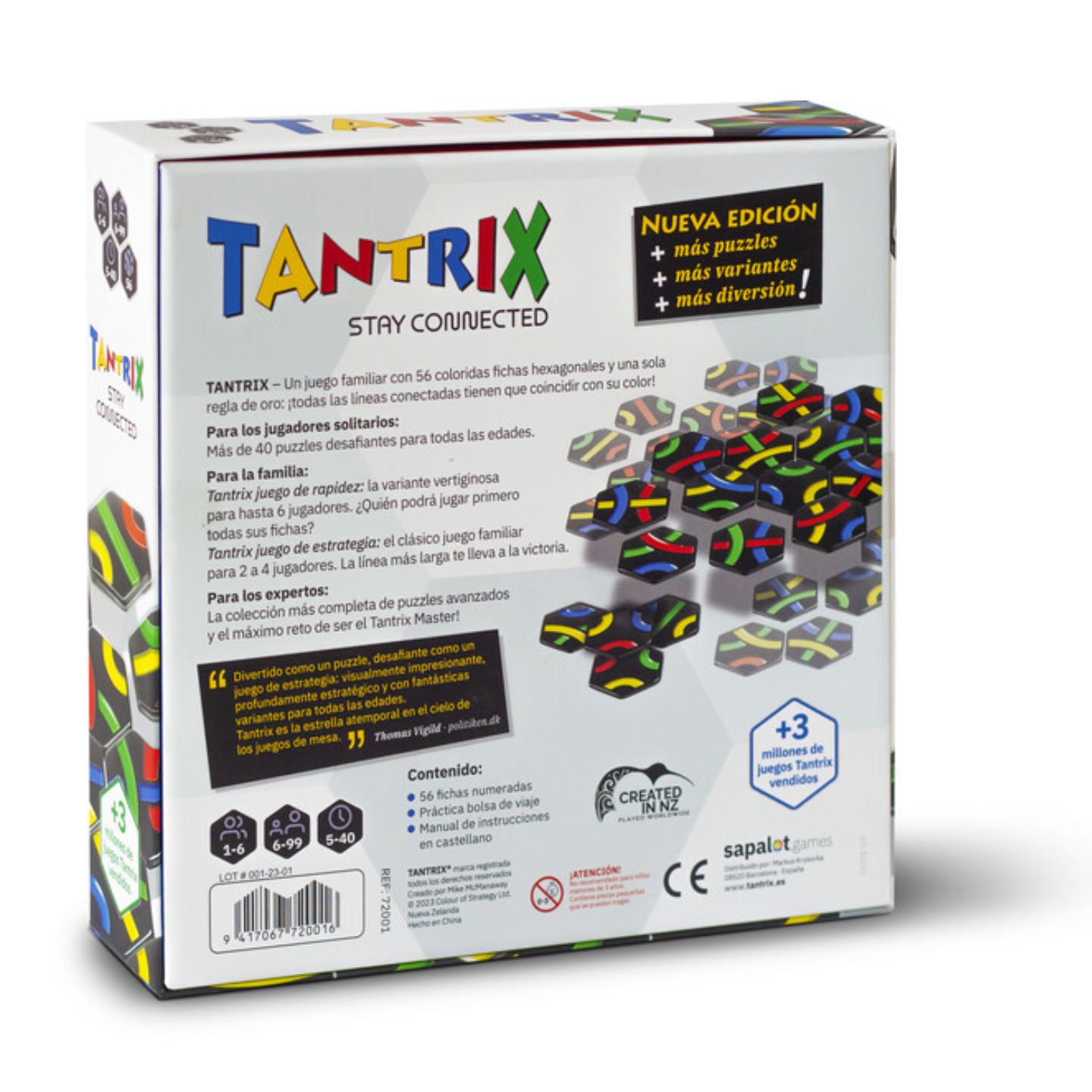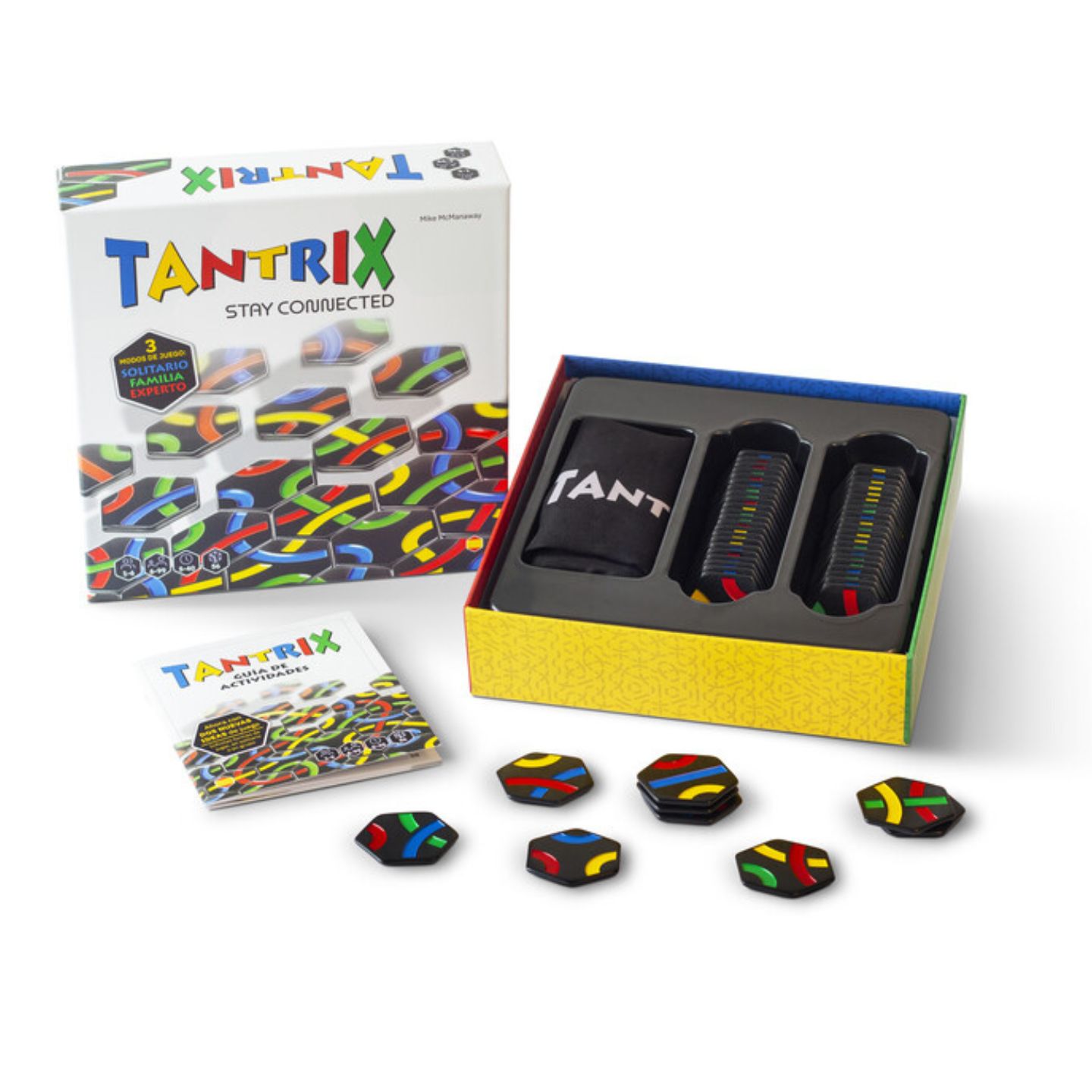 Tantrix es un juego de estrategia procedente de Nueva Zelanda formando por fichas hexagonales negras con lineas de colores en una cara y números en la otra. Con ellas podrás enfrentarte a retos, hacer puzzles, ordenar y clasificar fichas y un sin fin de posibilidades más.