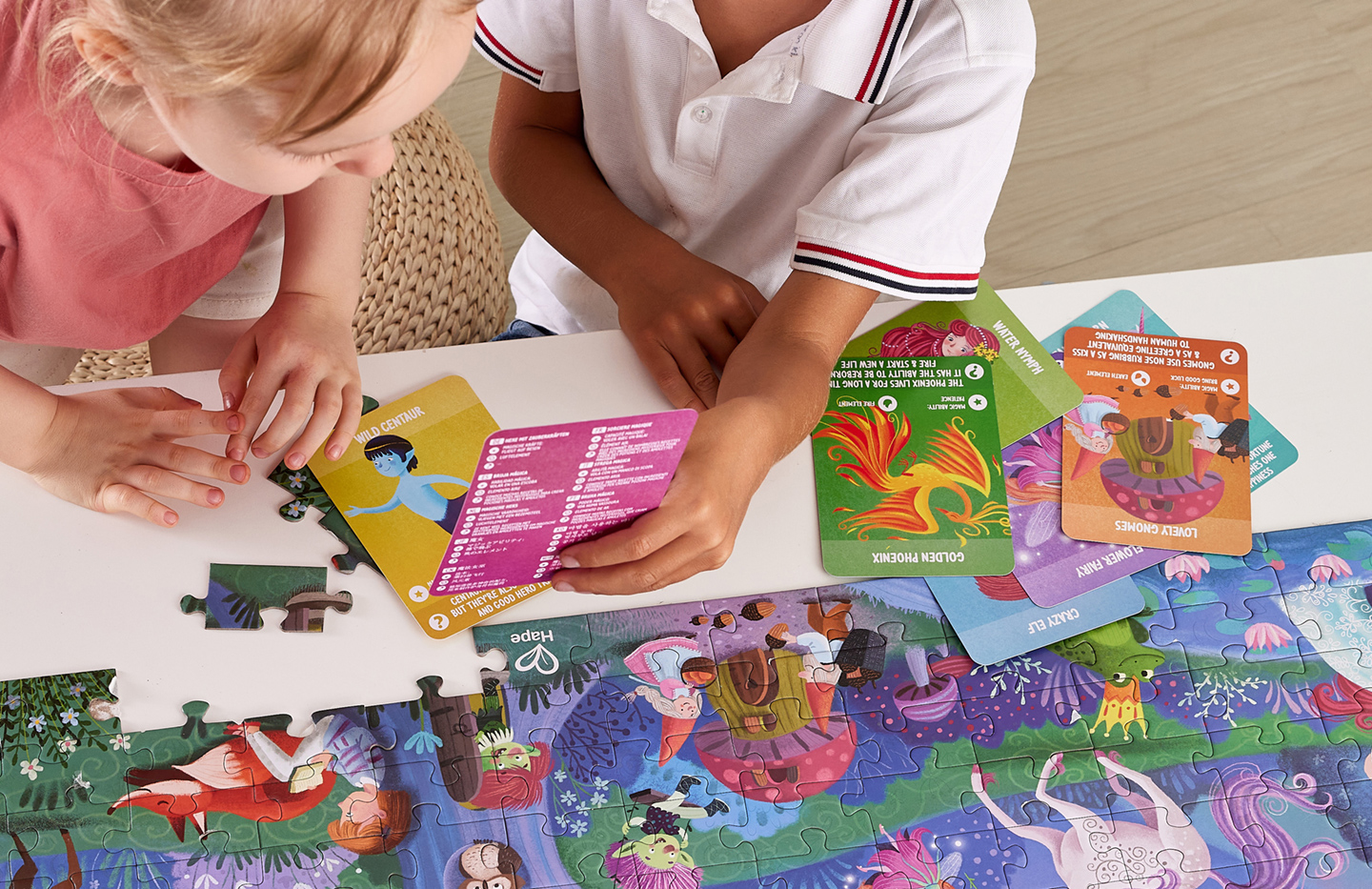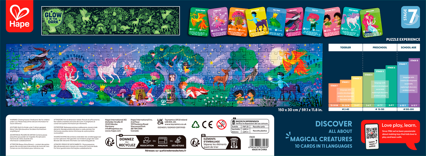 Este puzzle tiene personajes, estrellas y parte del paisaje con la capacidad de brillar en la oscuridad, además de incluir 10 cartas con datos interesantes sobre las criaturas mágicas que puedes observar.