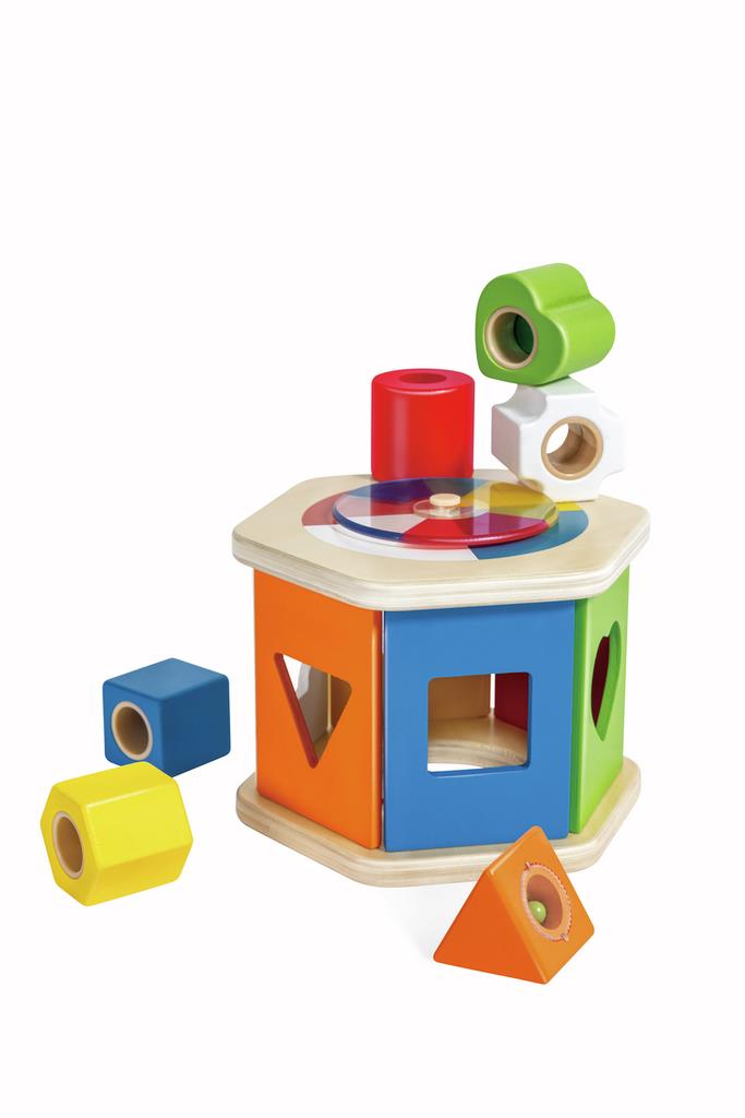 Aprende las formas y los colores y pásatelo en grande con esta caja de formas. Mete las piezas en su interior y luego mete la mano en la goma elástica para recuperarlas. Además, podrás descubrir los colores que resultan al combinar otros, ya que uno de sus laterales incluye una rueda de mezcla que sirve para combinar sus colores con los del fondo, dando resultados diferentes.