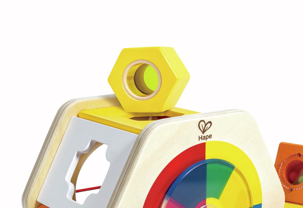 No te quedes solo con esto, cada pieza tiene una función: el triángulo tiene sonido al agitarlo, la cruz un espejos y las otras cuatro un metacrilato de color para experimentar con la vista.