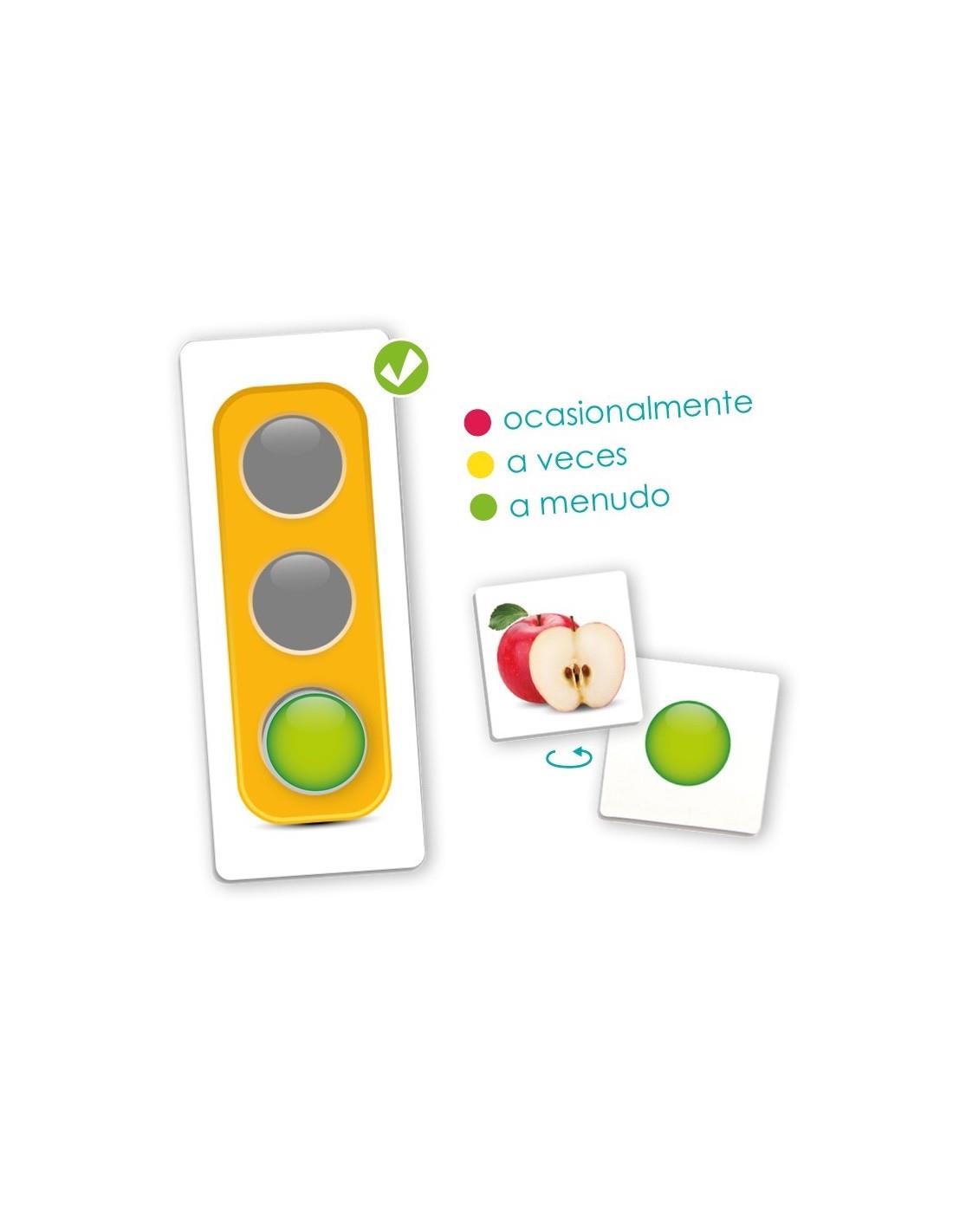 Cada alimento debe relacionarse con un color según la frecuencia con la que se deba consumir. Para facilitar el trabajo autónomo por parte de los pequeñas y las pequeñas, cada alimento trae en el reverso el color correspondiente, para que puedan comprobar su respuesta.