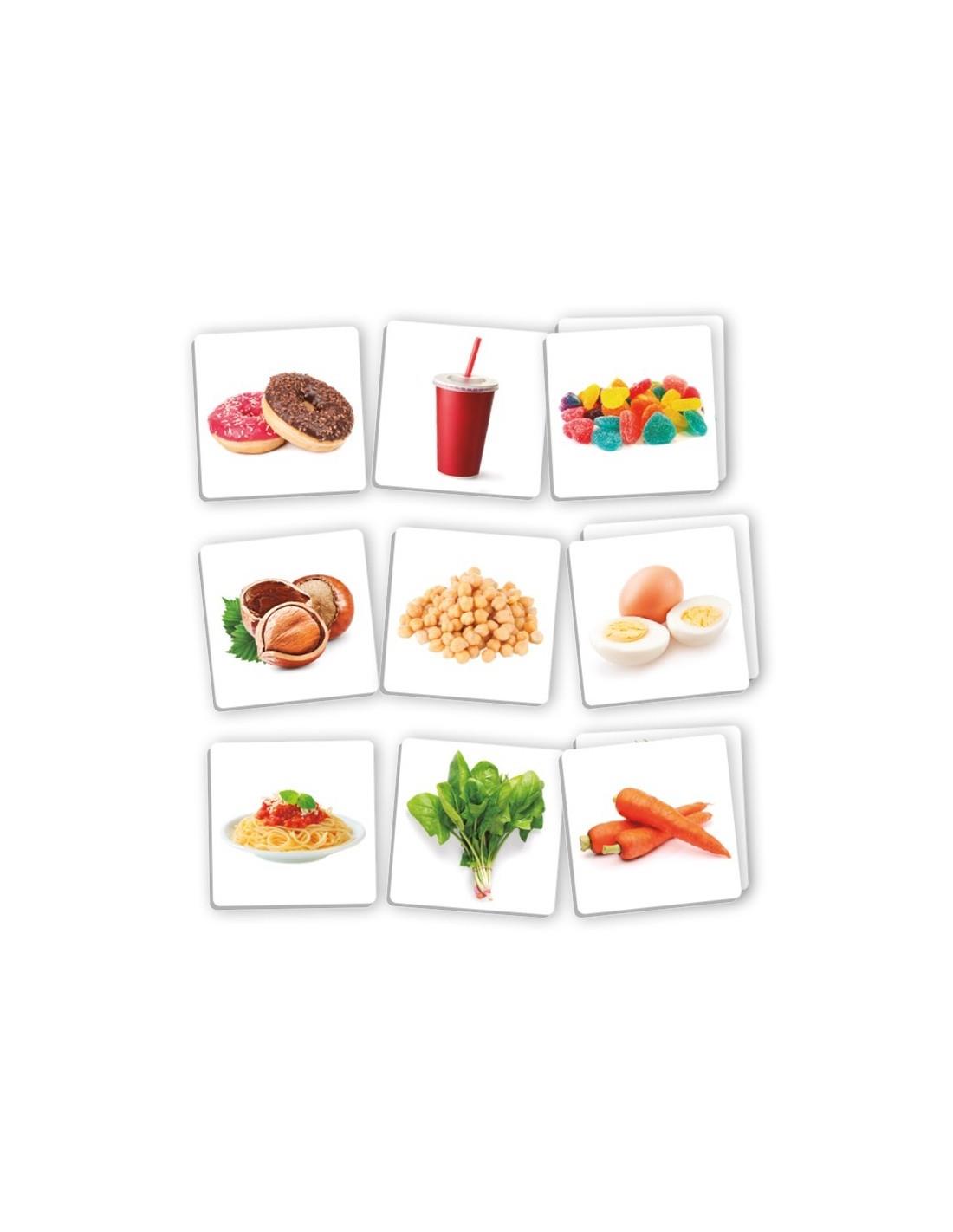- Con un total de 54 fichas de alimentos (7 x 7 cm.) y 60 fichas redondas de cartón de colores (verde, amarillo y rojo)