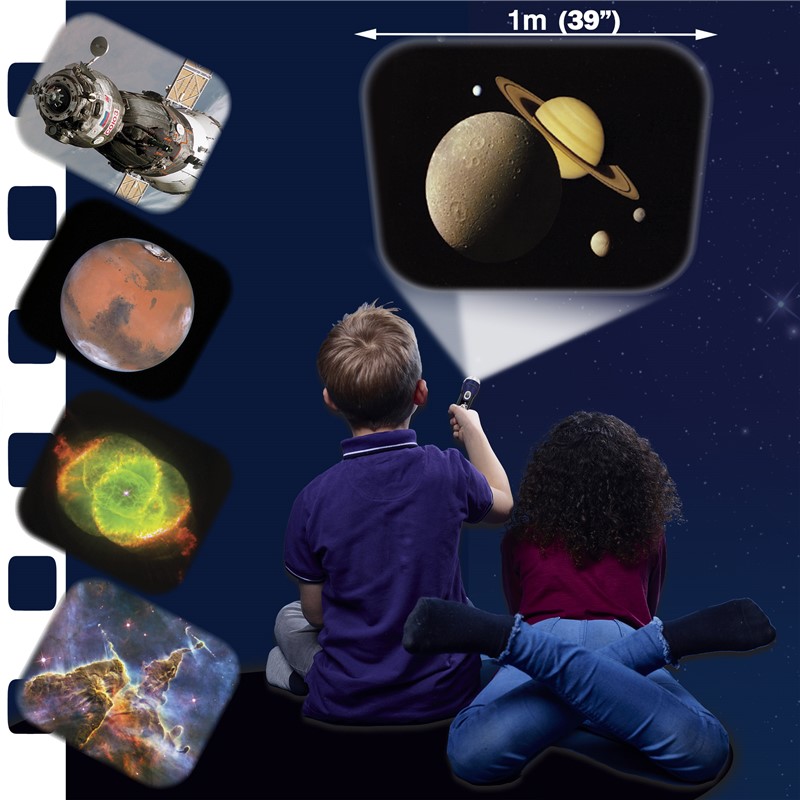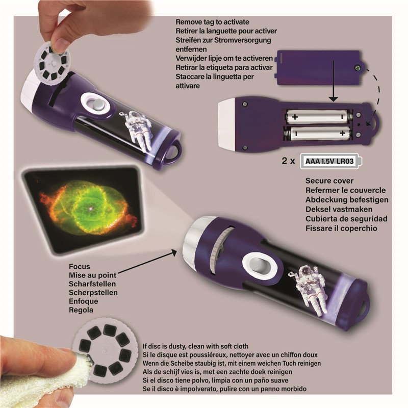 ¿Creías que las linternas solo servían para alumbrar? Con esta podrás explorar las nebulosas, los planetas, las naves espaciales, los satélites... ¡La galaxia entera en tus manos! Se trata de una linterna proyector portátil de imágenes del espacio. Tan sólo tendrás que colocar los discos en la ranura y girar la parte delantera de la linterna para enfocar. Además puedes llevarla a donde quieras porque trae una cadena para no perderla, así tendrás el espacio allá donde estés.