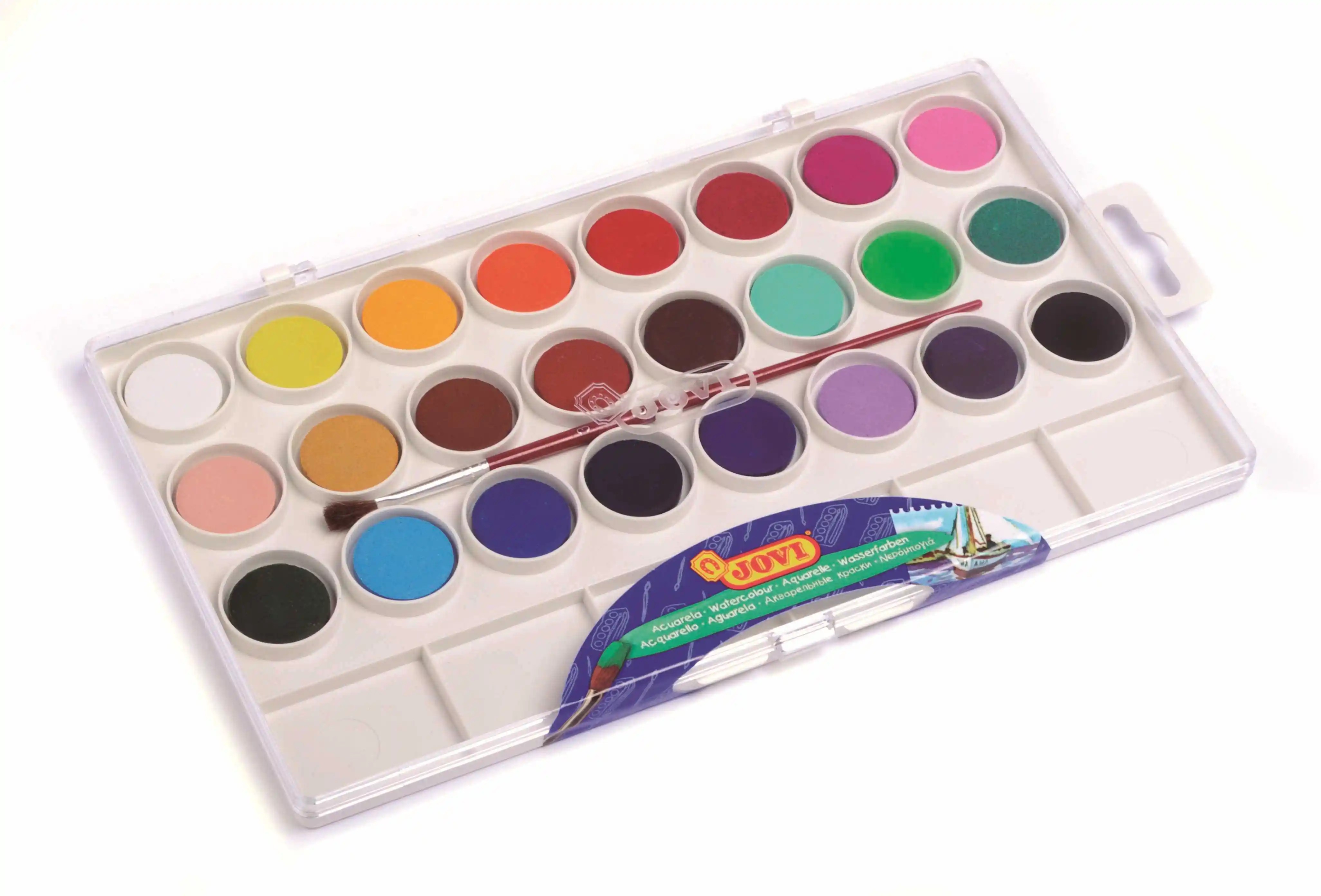 Caja de acuarelas escolares de 24 colores, de la marca Jovi.