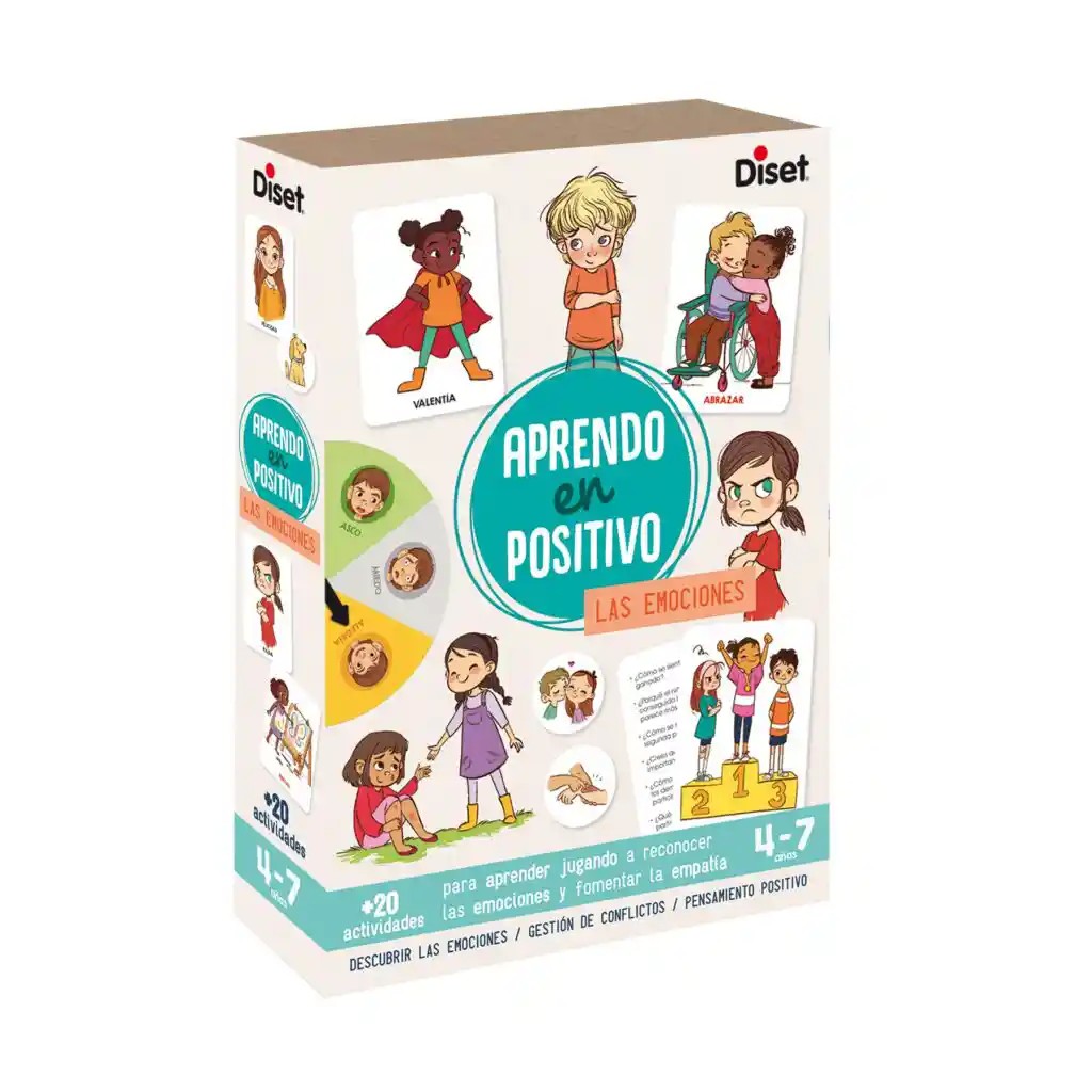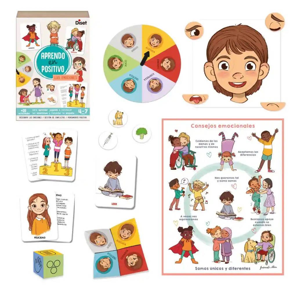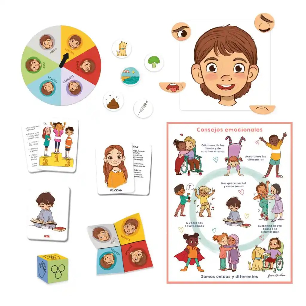 - Trae 20 cartas de emociones, 10 cartas de situaciones, 10 cartas de gestión de emociones, 30 fichas circulares con acciones y elementos cotidianos, una lámina de cara con 18 fichas para crear caras diferentes, una ruleta de emociones, un dado de actividades, un comecocos y un póster a doble cara